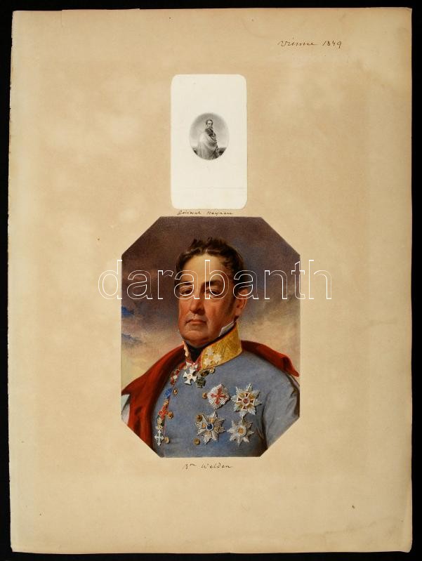 Josef Kriehuber (1800-1876)-nek tulajdonított: Ludwig von Welden báró, osztrák hadvezér portréja. Akvarell, papír. Jelzés nélkül. Egy nagyobb lapra ragasztva. A lapon felette Báró Julius Jacob von Haynau (1786-1853) osztrák hadvezér kőnyomatos képe. Welden protréjának mérete 22,5 cm x 16,5 cm. Proveniencia: feltehetőleg Alexander Hübner (1811-1892) osztrák diplomata gyűjteményéből /