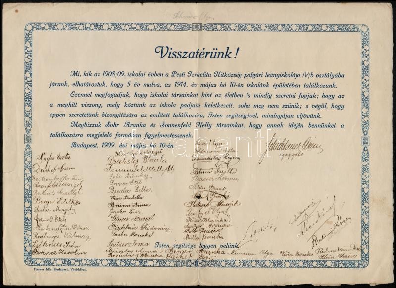 1909 a Pesti Hitközség polgári leányiskolája IV. b. osztályának emléklapja leendő osztálytalálkozóról, a diákok mellett Schichtanz Ármin (1862-?) iskolaigazgató és Rubinyi Mózes (1881-1965) osztályfőnök, irodalomtörténész aláírásával