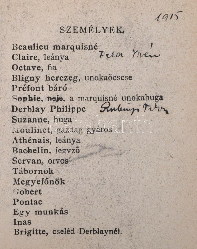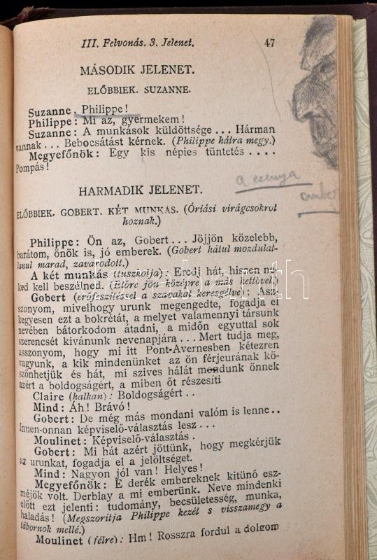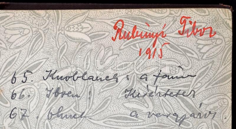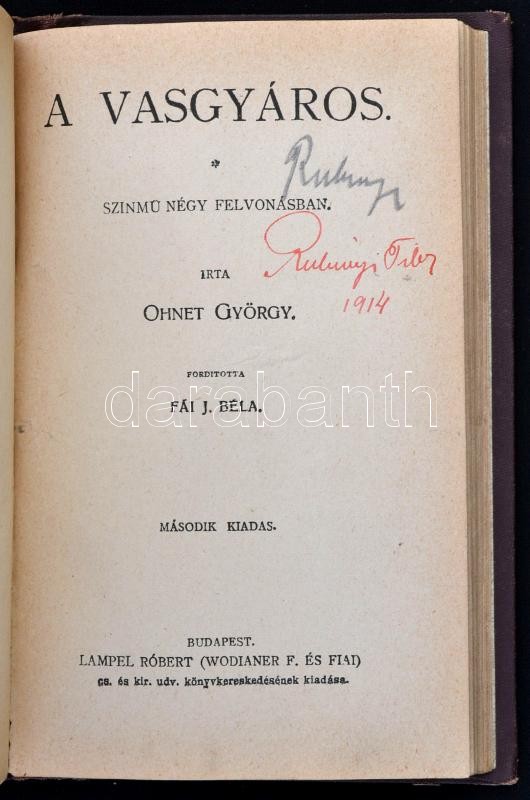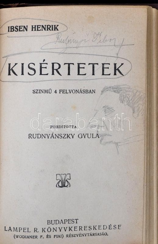 Ibsen Henrik: Kísértetek. Színmű 4 felvonásban. Fordította: Rudnyánszky Gyula.+Ohnet György: A vasgyáros. Színmű négy felvonásban. Fordította: Fáj J. Béla. Második kiadás. (Egy kötetben.) Bp.,1913, Lampel R. (Wodianer F. és Fiai) Rt.,91+67+74 p. Korabeli egészvászon-kötés, kopottas, foltos borítóval. Rubinyi Tibor (1896-1945) zsidó származású színész névbejegyzéseivel, bejegyzéseivel, és rajzaival, dátumozásokkal (1913,1914,1915.) (1915-ben végezte el a Színiakadémiát.)