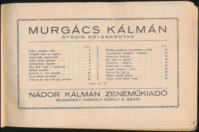 Murgács Kálmán ötödik nótáskönyve. Bp., é. n., Nádor Kálmán Zeneműkiad... https://www.darabanth.com/hu/28-Nagyaukcio/28.1/Festmeny-mutargy-papirregiseg-egyeb/Konyvek-Egyeb-ritkasagok~11208/Murgacs-Kalman-otodik-notaskonyve-Bp-e-n-Nador-Kalman-Zenemukiado-Murgacs-ala~II1621999
