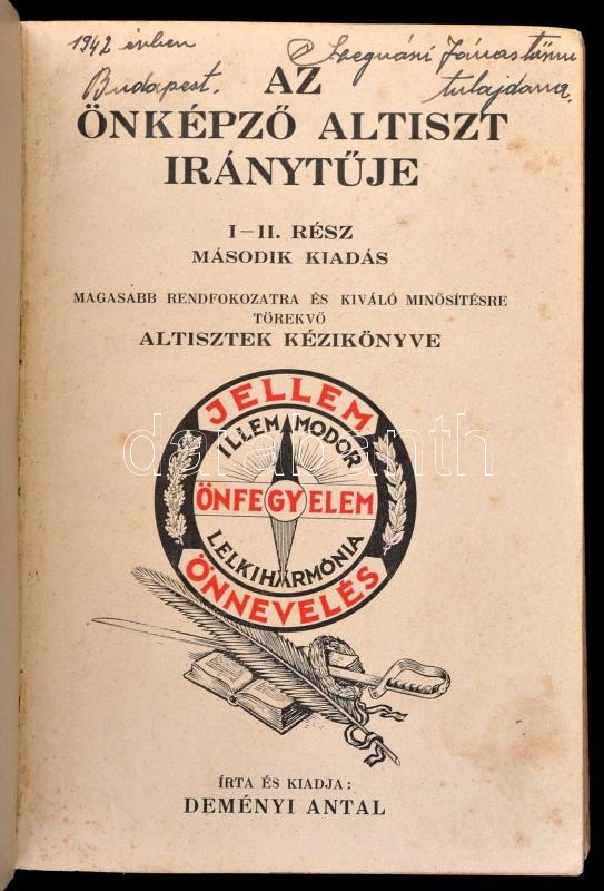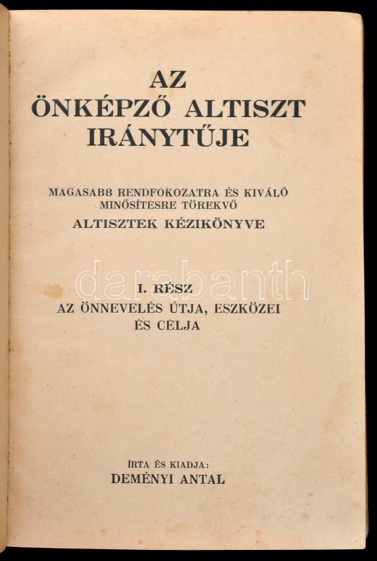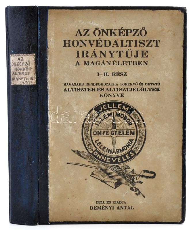 Deményi Antal: Az önképző altiszt iránytűje a magánéletben. I-II. rész. Magasabb rendfokozatra és kiváló minősítésre törekvő altisztek kézikönyve. I. rész: Az önnevelés útja, eszközei és célja. II. rész: Illem, modor, udvariasság az otthon és az élettársak lelki összhangja. Bp.,(1934), Szerzői kiadás,(Stádium-ny.),340 p. Második kiadás. Átkötött félvászon-kötés, javított kötéssel, az eredeti borítót az átkötéskor felhasználták.