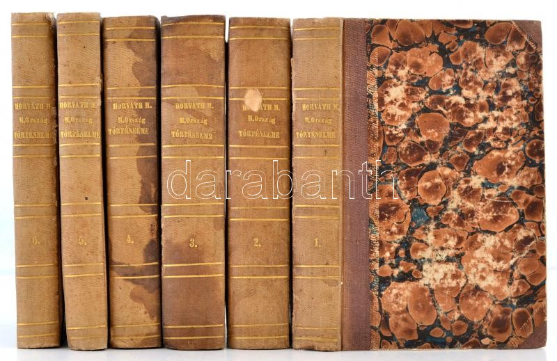 Dr. Horváth Mihály: Magyarország történelme 1-6. kötet. Ujonnan átdolgozta Dr. Hatvani Mihály. Pest, 1860-1863, Heckenast Gusztáv, IV+501+1 p.; 736 p.;2+725+1 p.;543+1 p.;455+1 p.;422+1 p. Második kiadás (1-2 kötet). Új dolgozat (3-6. kötet). Korabeli aranyozott félvászon-kötés, a borÃtók és a gerincek kissé kopottasak, a II. kötet gerince kissé sérült, de belül jó állapotban, festett lapélekkel.