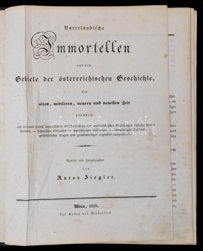 Vaterländisches Immortellen aus dem Gebiete der österreichischen Geschichte. Szerk.: Ziegler, Anton. écs, 1838, szerzői. Számos rézmetszetes illusztrációval. Kopott, díszes gerincű félvászon kötésben.