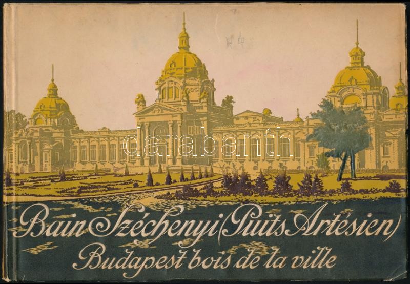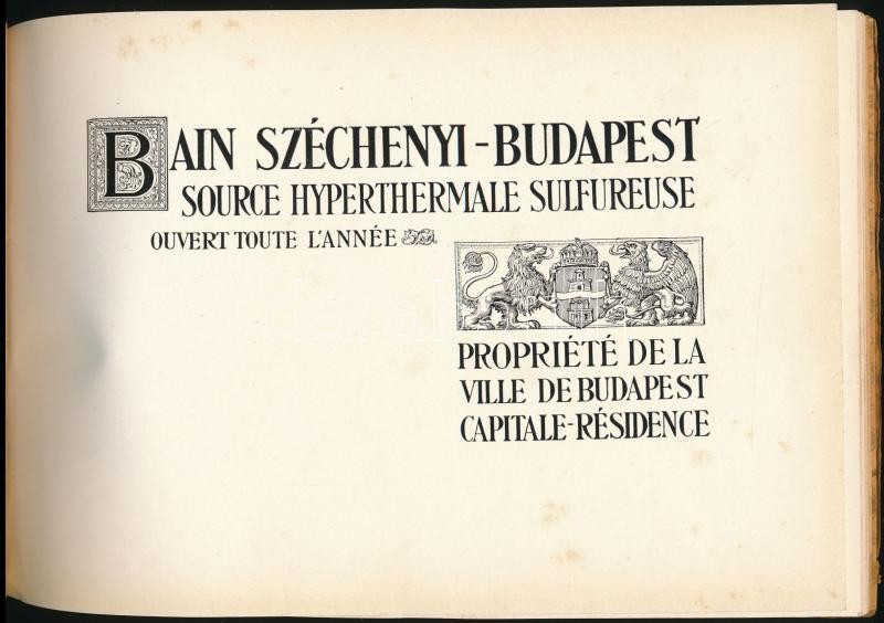 Bain Széchényi-Budapest. Source hyper-thermale sulfureuse ouvert toute l'année. Bp.,1914, Budapest Székesfőváros Házinyomdája, 8 sztl. lev.+20 t. Fekete-fehér egészoldalas fényképekkel, térképpel, ábrával illusztrálva. Egy illusztrációval a városligetről, előtte feliratos hártyapapírral. Kiadói, színes, illusztrált, dombornyomásos papírkötésben, haránt alakú, francia nyelven.