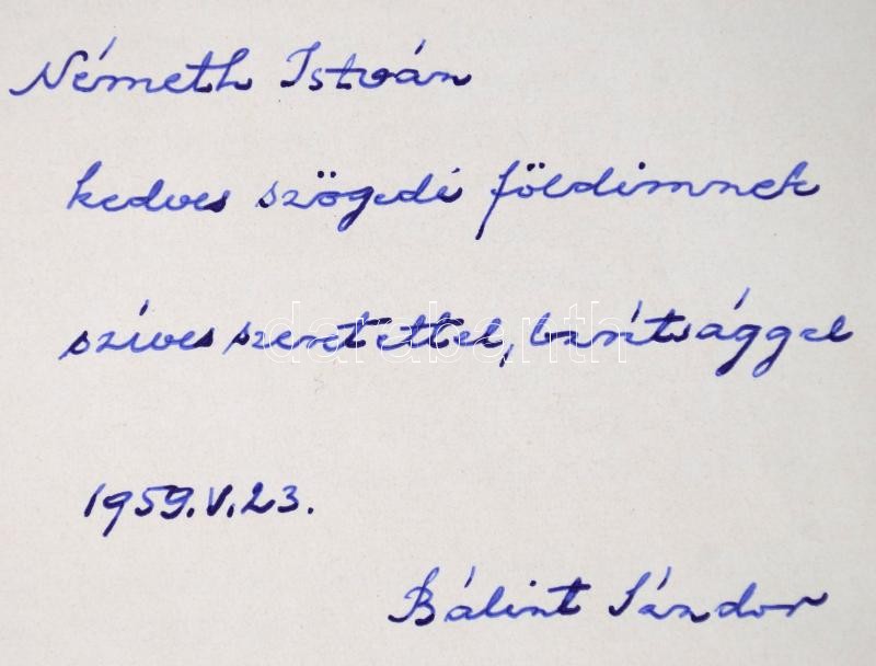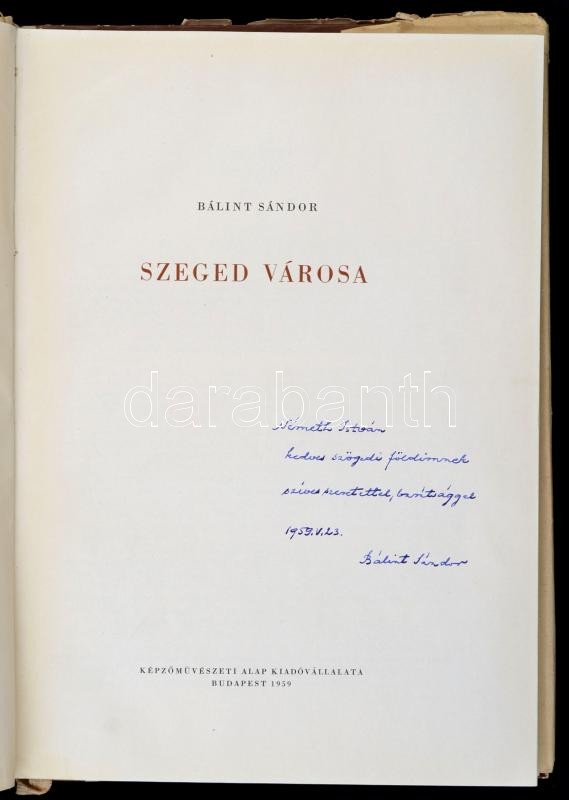 Leírás: Bálint Sándor: Szeged városa. Bp.,1959, Képzőművészeti Alap. Kiadói félvászon-kötés, kiadói papír védőborítóban, szakadt, hiányos papír védőborítóban. A szerző, Bálint Sándor (1904-1980) által dedikálva.