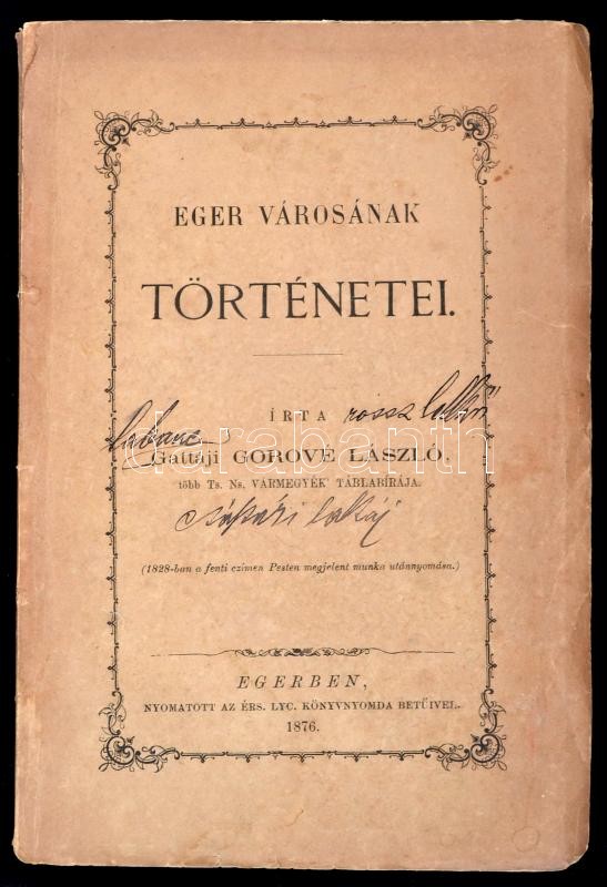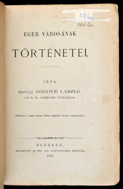 Gattáji Gorové László (1780-1836): Eger városának történetei. Eger, 1876, Érseki Lyceumi Könyvnyomda, 286 p Második kiadás. Kiadói papírkötés, a hátsó borító foltos, magánkönyvtári címkével, jó állapotban. Ritka! Az első kiadás 1828-ban jelent meg. A címlapon bejegyzés: [Írta Gattáji Gorové László] 'rossz lelkű labanc császári lakáj'.