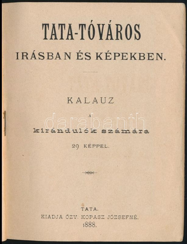 Tata-Tóváros írásban és képben. Kalauz a kirándulók számára. Tata, 1888, Özv. Kopasz Józsefné. Kiadói illusztrált papírkötés, gazdag fekete-fehér képanyaggal illusztrálva, a 24-es képtábla szakadt.