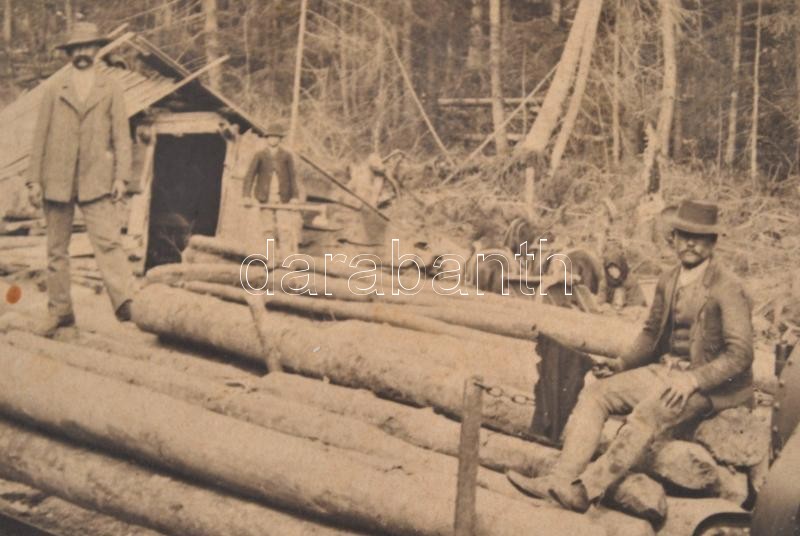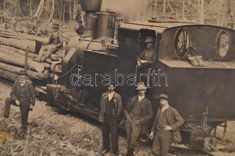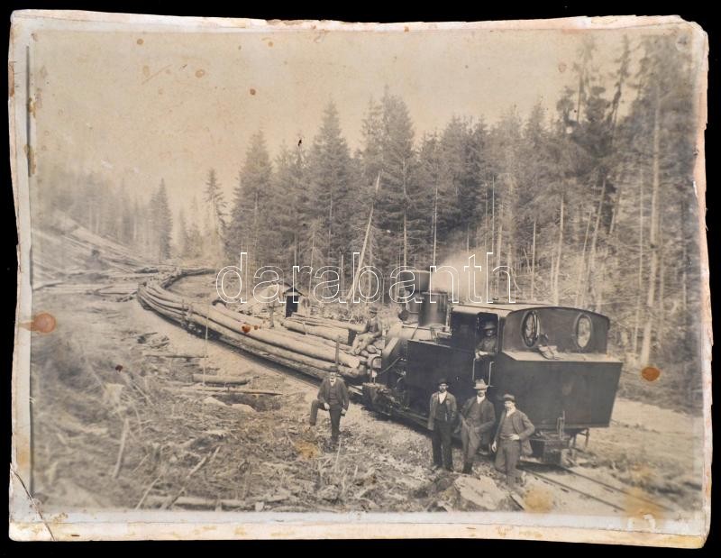 Leírás: cca 1900 Gyergyóalfalu, hegyi kisvasút, nagyméretű fotó, kartonra ragasztva, szélein sérülésekkel, 31×42 cm