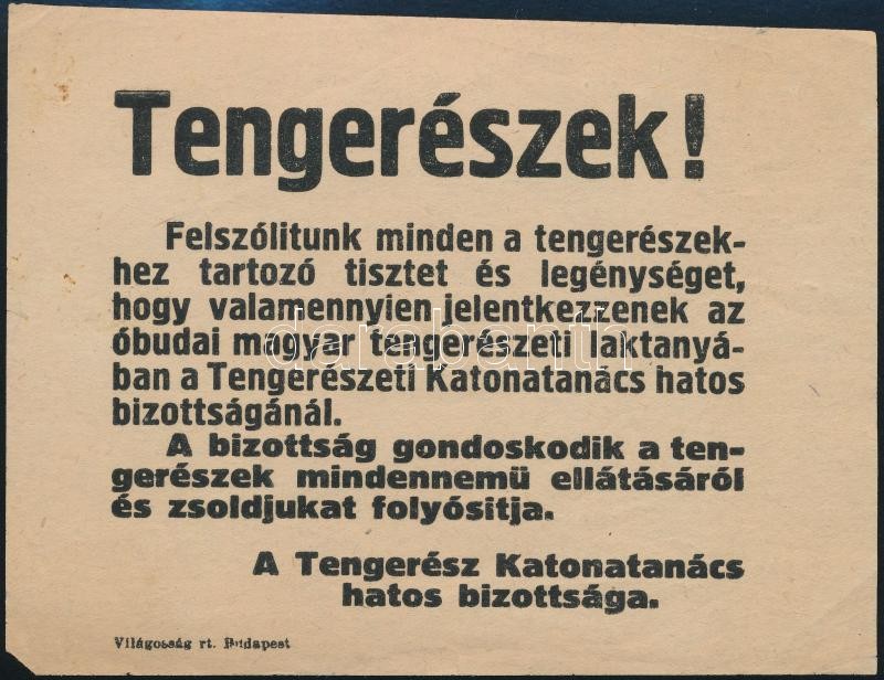 1918 a Tengerész Katonatanács hatos bizottsága gyülekezési felhívása, ... https://www.darabanth.com/hu/28-Nagyaukcio/28.1/Festmeny-mutargy-papirregiseg-egyeb/Militaria~11299/1918-a-Tengeresz-Katonatanacs-hatos-bizottsaga-gyulekezesi-felhivasa-szorolap-11C39715-cm~II1681045