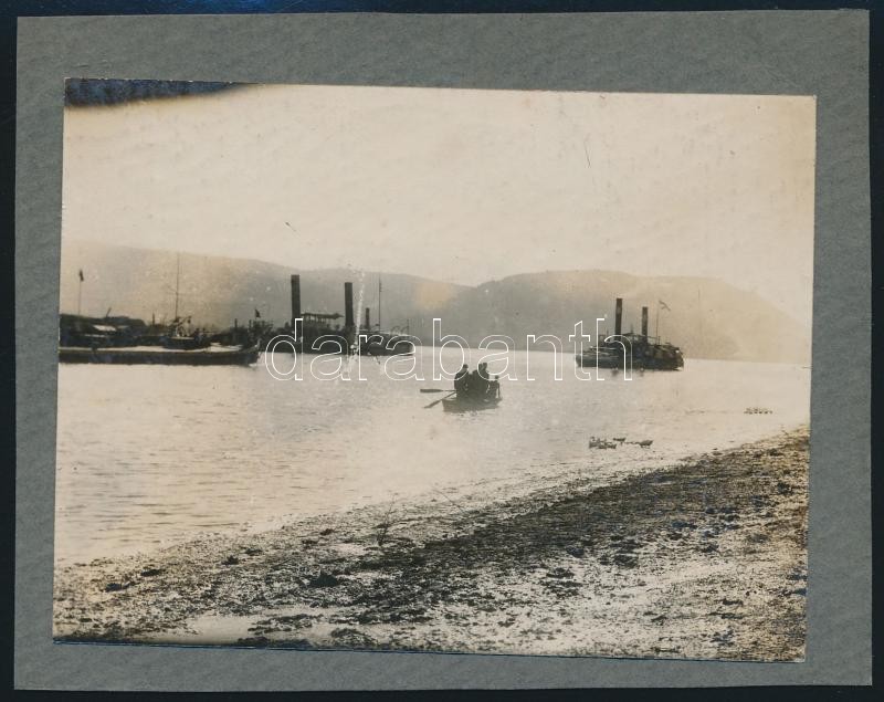 Leírás: cca 1920-1930 Magyar királyi folyamőrök csoportképe, egyikük búvárruhába öltözve, hátoldalon hajók a Dunán, 2 db fotó, 9x12 cm