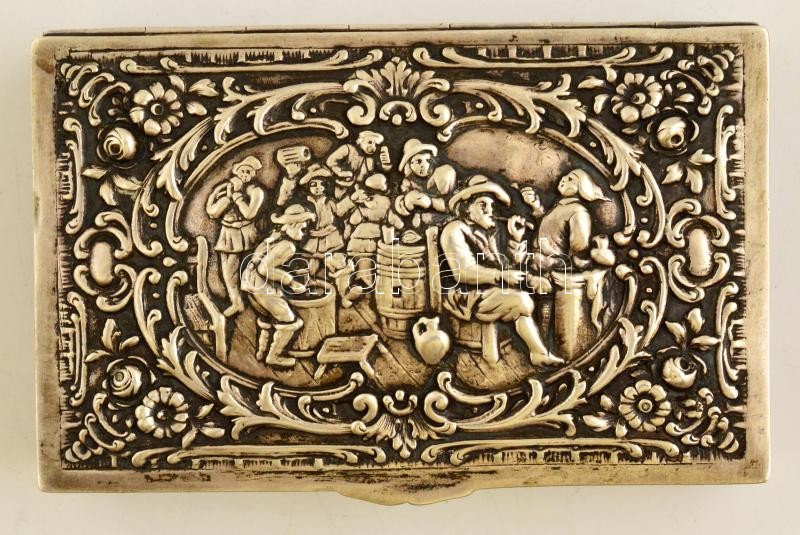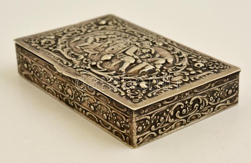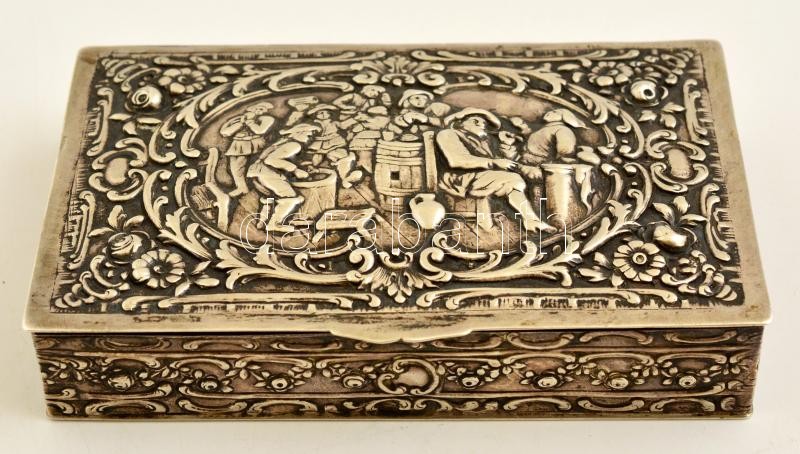 Leírás: Ezüst (Ag) doboz, préselt szüreti jelenettel, jelzett, 11,5×7 cm, nettó:177 g / Silver box, hallmarked, 177 g net.