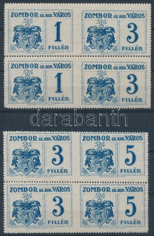 Leírás: 1914 Zombor városi illetékbélyeg 2 db középen fogazatlan négyestömb / 2 blocks of 4 (1f-3f, 3f-5f)