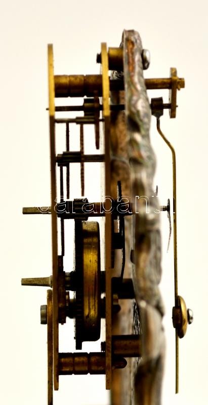 XX. század. Zappler óra búra alatt, kézzel készült vadászjelenetet ábrázoló ezüst díszítéssel, felhúzókulcsokkal, hibátlanul működő szerkezettel, plexi búra alatt / 20th century zappler clock under plexi with silver hunting scene. With two winding keys. Works well. 19x20 cm