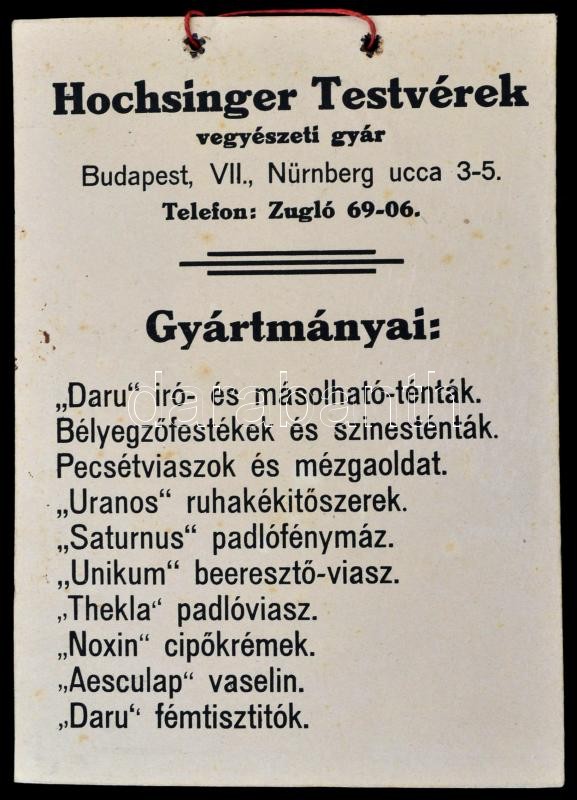 cca 1920 Daru Ténták, Hochsinger Testvérek vegyészeti gyár, kétoldalas reklám kisplakát, litográfia, Grund V. utódai, 24,5x17,5 cm / Advertisement poster, lithography, 24,5x17,5 cm