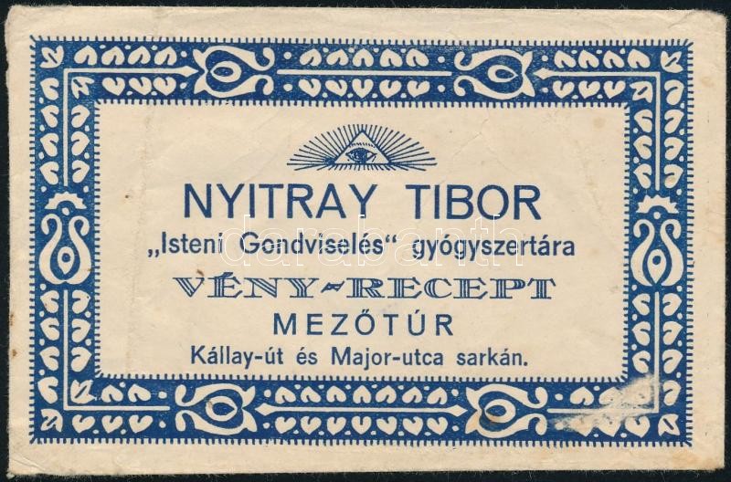 cca 1930 Mezőtúr, Nyitray Tibor "Isteni Gondviselés" gyógysz... https://www.darabanth.com/hu/28-Nagyaukcio/28.1/Festmeny-mutargy-papirregiseg-egyeb/Reklam~11185/cca-1930-Mezotur-Nyitray-Tibor-Isteni-Gondviseles-gyogyszertara-reklamos-receptboritek~II1679604