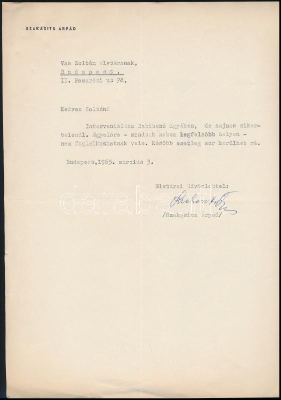 1965 Szakasits Árpád (1888-1965) volt köztársasági elnök saját kézzel aláírt levele Vas Zoltán (1903-1983) író, 56-os államminiszter részére melyben Vas mint irodalmárnak Babits Mihály felesége Tanner Ilona ügyében kért interveniálására valászol, hogy az felsőbb utasításra nem kivitelezhető. Ez feltehetően Lukács György munkájának eredménye, aki mint a szocialista irodalmi kánon alakítója Babits Mihály munkásságának jelentőségét igyekezett kisebbíteni a korban.