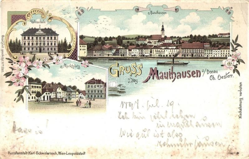 Leírás: 1898 Mauthausen, Volksschule, Marktplatz / school, market square. Kunstanstalt Karl Schwidernoch No. 2380. Art Nouveau, floral, litho (EK)