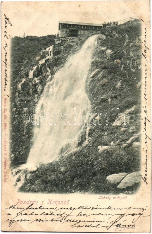 Leírás: Krkonose, Riesengebirge; Labsky Vodopad / Elbe waterfall with rest house. Emb. (fl)