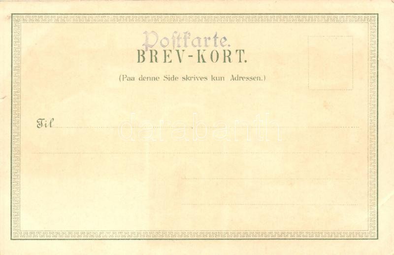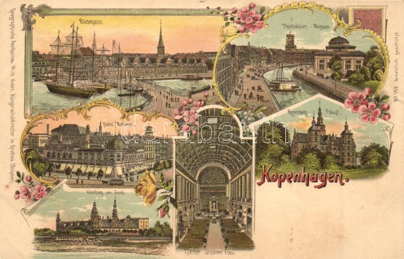 Copenhagen, Kopenhagen; Borsegasse, Thorvaldser Museum, Rosenberg Palast, Hotel National, Kronborg am Sund, Kirche Unserer Frau. Geographische Postkarte v. Wilhelm Knorr No. 142. Art Nouveau litho (small tear)