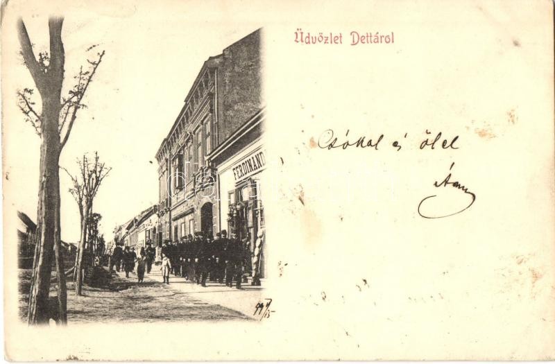 1899 Detta, Deta; utcakép katonákkal, Ferdinand üzlete / street view w... https://www.darabanth.com/hu/28-Nagyaukcio/28.1/Kepeslapok/Erdely~11304/1899-Detta-Deta-utcakep-katonakkal-Ferdinand-uzlete-street-view-with-marching-soldiers-shop~II1646400