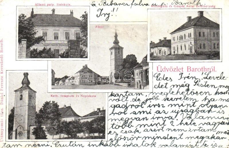 Barót, Baraolt; Állami polgári fiú iskola, Katolikus templom és népiskola, Fő tér, községház, Gáspár Antal üzlete / school, shop, town hall, church, main square (EK)