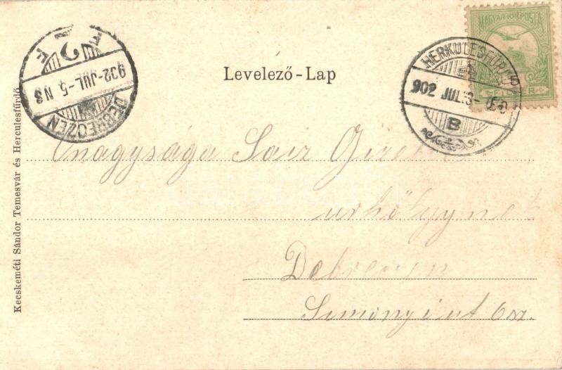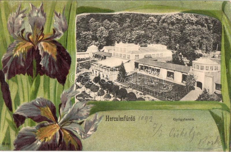 Leírás: Herkulesfürdő, Baile Herculane; Gyógyterem, virágos litho keret. Kecskeméti Sándor kiadása / spa. Flowers, Art Nouveau, litho (EK)