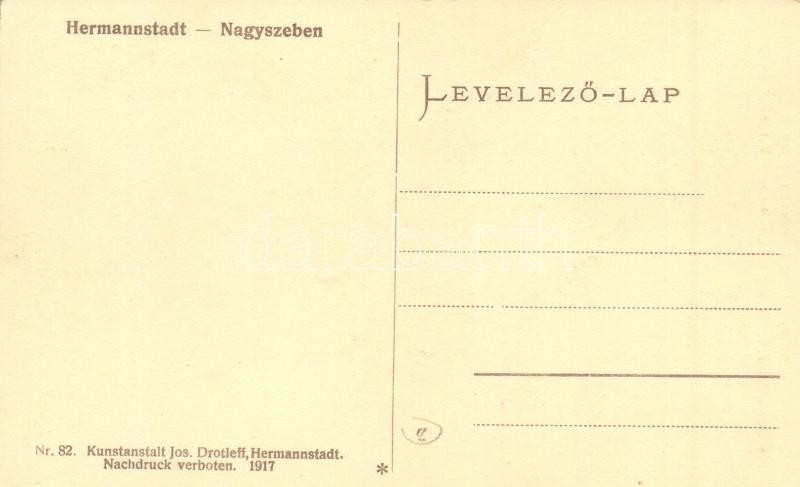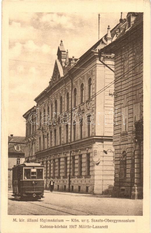 Nagyszeben, Hermannstadt, Sibiu; M. kir. állami főgimnázium, Katona kórház, villamos / Kön. ung. Staats-Obergymnasium, Militär-Lazarett. Kunstanstalt Jos. Drotleff / grammar school, military hospital, tram (EK)