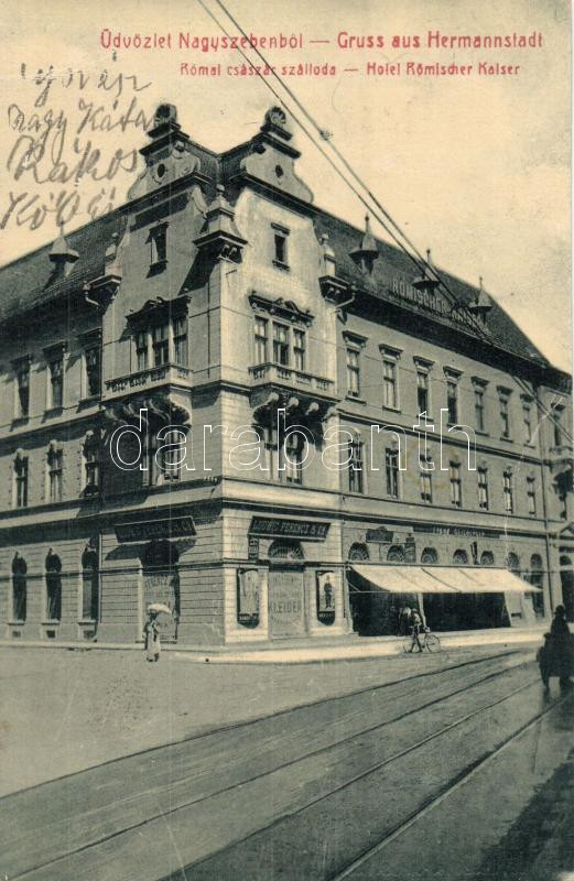 Nagyszeben, Hermannstadt, Sibiu; Római császár szálloda, Ludwig Ferencz & Co. és Franz Geisberger üzlete; W. L. 54. kiadja Budovszky L. / Hotel Römischer Kaiser / hotel, shops, street view