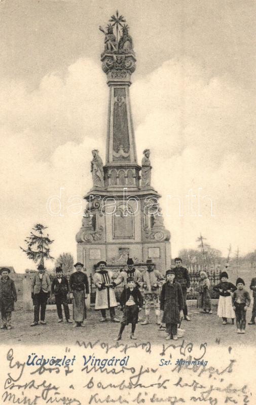 Leírás: Vinga, Szentháromság szobor falubeliekkel / monument with villagers