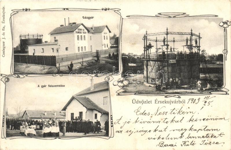 Leírás: Érsekújvár, Nové Zámky; Gázgyár és a gyár felszentelése. Conlegner J. és fia kiadása / gas factory and it's consecration. floral Art Nouveau (EK)