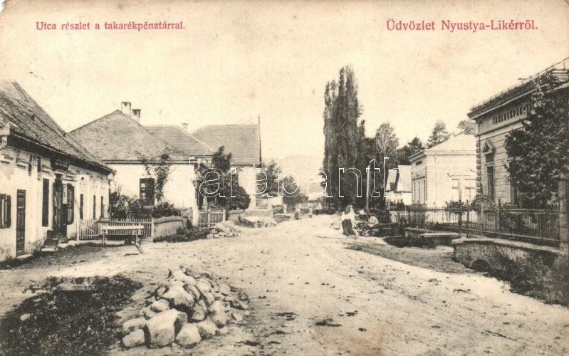 Leírás: Nyustya-Likér, Hnústa-Likier; utcakép takarékpénztárral / street view with savings bank (EM)