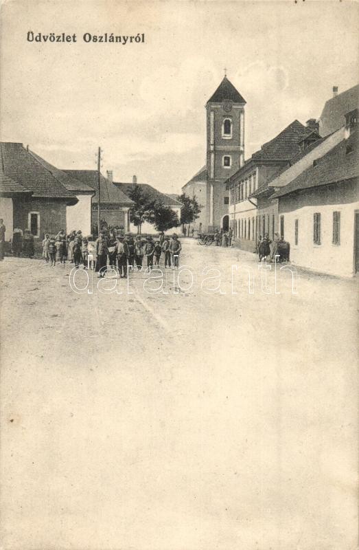 Leírás: Oszlány, Oslany; utcakép templommal / street view with church / Strassenbild mit Kirche
