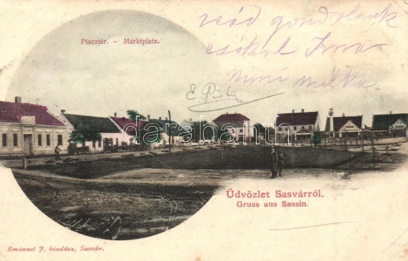 Leírás: Sasvár, Sassin, Sastin; Piac tér. Emánuel J. kiadása / market square (Rb)