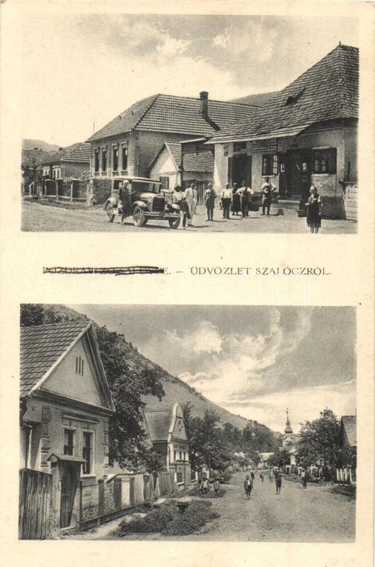 Leírás: Szalóc, Slavec; utcaképek, Ambrus Béla üzlete és saját kiadása, automobil / street views with shop and automobile