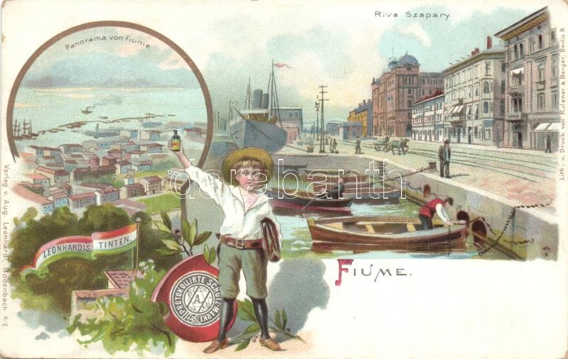 Fiume, Riva Szapary, Leonhardis Tinten advertisement card. Verlag von ... https://www.darabanth.com/hu/28-Nagyaukcio/28.1/Kepeslapok/Horvatorszag-Delvidek~11307/Fiume-Riva-Szapary-Leonhardis-Tinten-advertisement-card-Verlag-von-Aug-Leonhardi-litho~II1686165