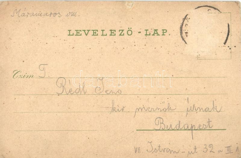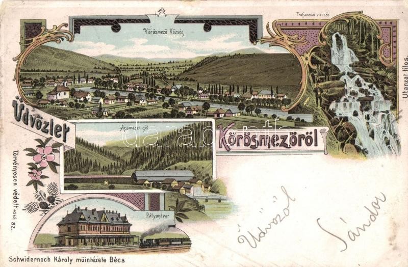 Leírás: Kőrösmező, Yasinia, Jassinja, Jasina (Máramaros); Apsineczi gát, vasútállomás, Trufaneczi vízesés. Schwidernoch Károly / dam, railway station, waterfall. Art Nouveau, floral, litho (r)