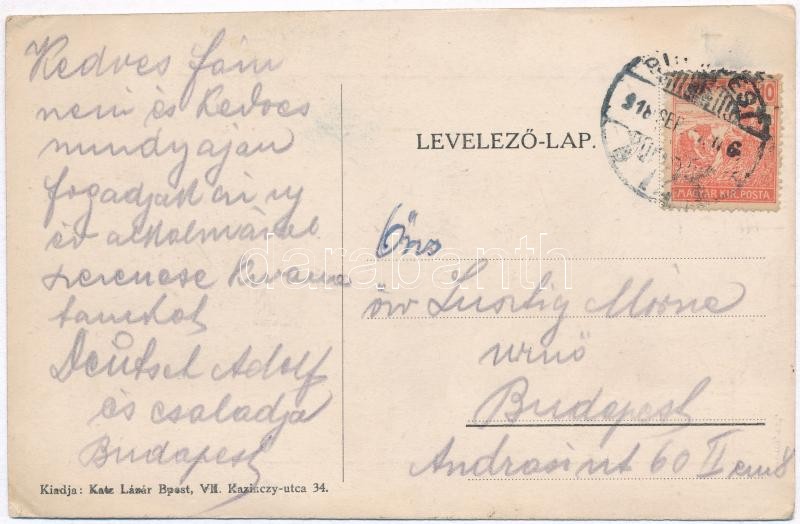 Leírás: Budapest VI. Új Ortodox izraelita templom Dob utcai homlokzata, zsinagóga, nyomtatott héber szöveggel, kiadja Katz Lázár (EK)