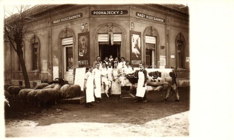 Leírás: Budapest XIX. Kispest, Fő utca 50. Podhajecky József hentes és mészáros üzlete, nagy húscsarnok. Mikody felvétele, photo (EK)