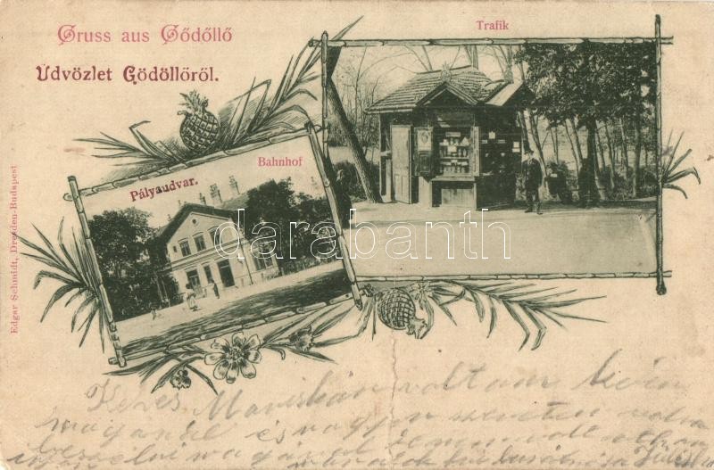 Gödöllő, vasútállomás, pályaudvar, Trafik. Floral, Art Nouveau (fa) https://www.darabanth.com/hu/28-Nagyaukcio/28.1/Kepeslapok/Magyarorszag~11303/Godollo-vasutallomas-palyaudvar-Trafik-Floral-Art-Nouveau-fa~II1647499