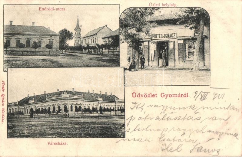 Gyoma, Endrődi utca, városháza, Pintér Ignácz üzlete és saját kiadása https://www.darabanth.com/hu/28-Nagyaukcio/28.1/Kepeslapok/Magyarorszag~11303/Gyoma-Endrodi-utca-varoshaza-Pinter-Ignacz-uzlete-es-sajat-kiadasa~II1646806