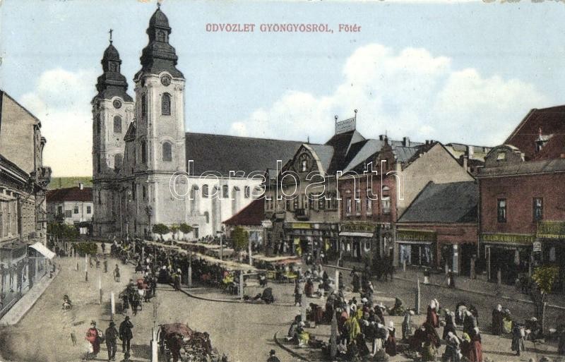 Leírás: Gyöngyös, Fő tér, templom, Goldner Dávid és fia üzlete, piac