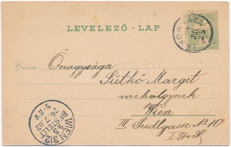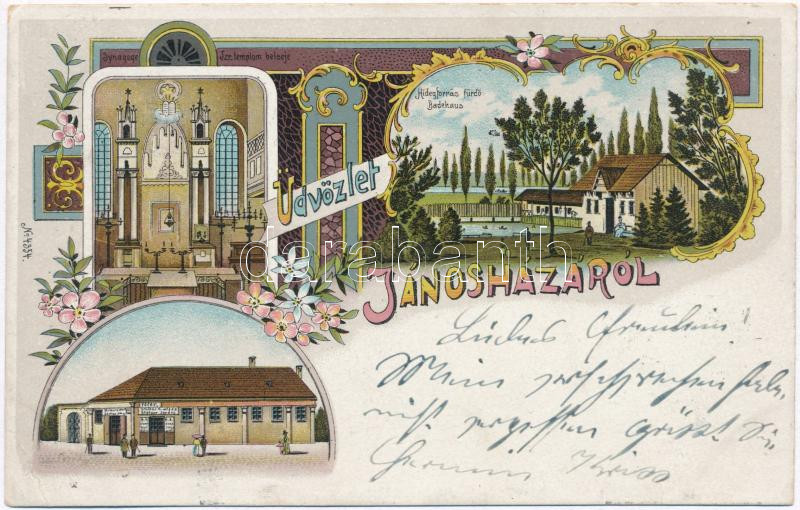 Leírás: Jánosháza, Izraelita templom belseje, zsinagóga belső, Hidegforrás fürdő, Steiner M. utóda Steiner Ignácz üzlete, floral, litho (EK)