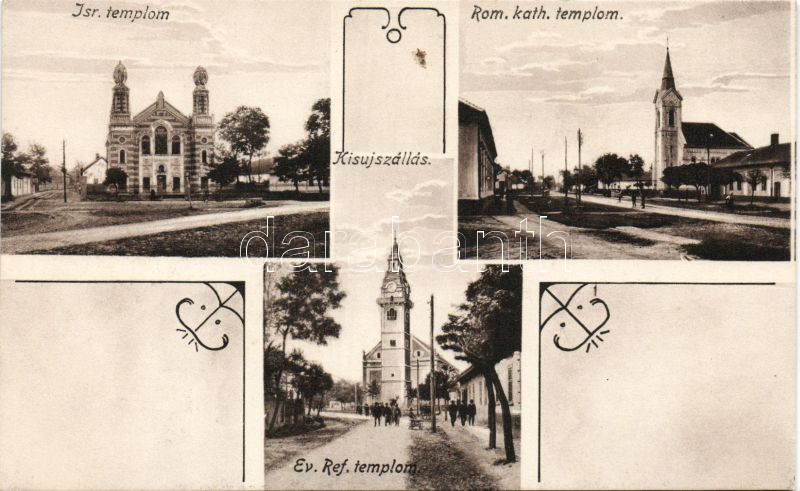 Leírás: Kisújszállás, Zsinagóga, katolikus és református templomok; kiadja Záhony Lajos