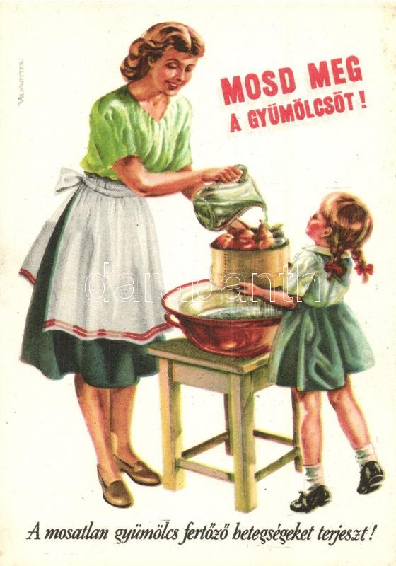 Mosd meg a gyümölcsöt! A mosatlan gyümölcs fertőző betegségeket terjeszt! Kiadja az Egészségügyi Minisztérium / Hungarian health propaganda s: Vilnrotter (EK)