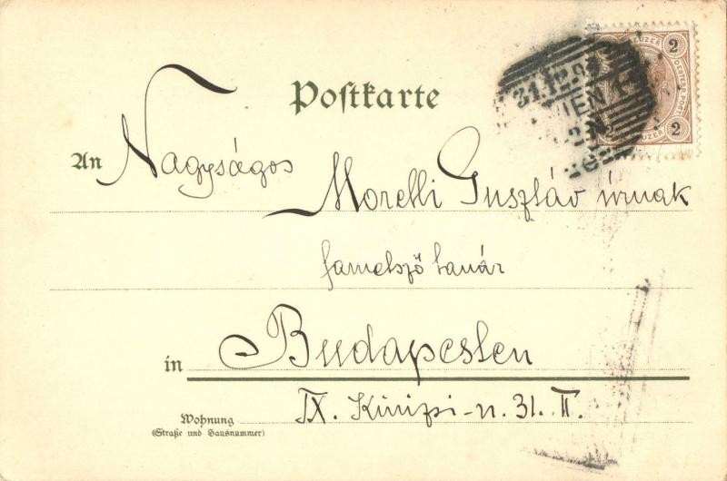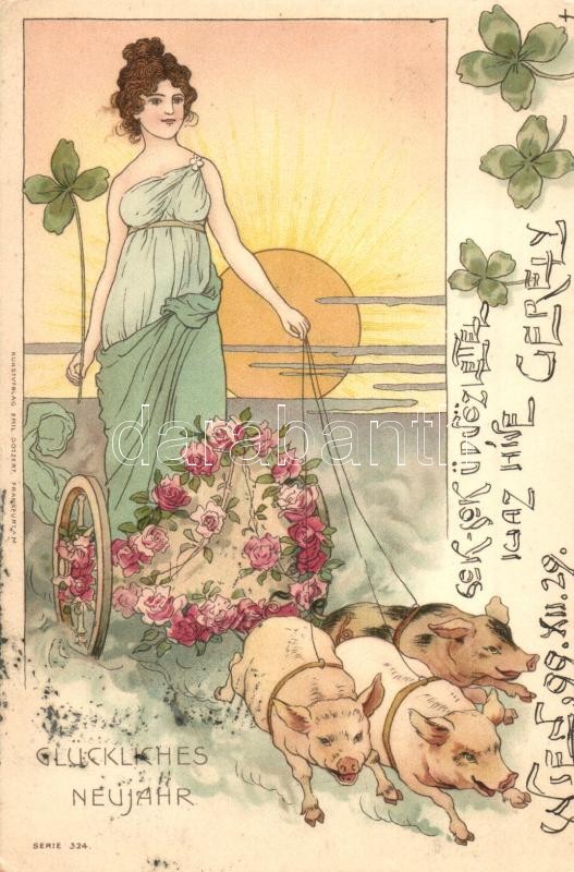 Leírás: 1899 Glückliches Neujahr! / Art Nouveau lady on pig cart. Kunstverlag Emil Dotzert Serie 324. litho