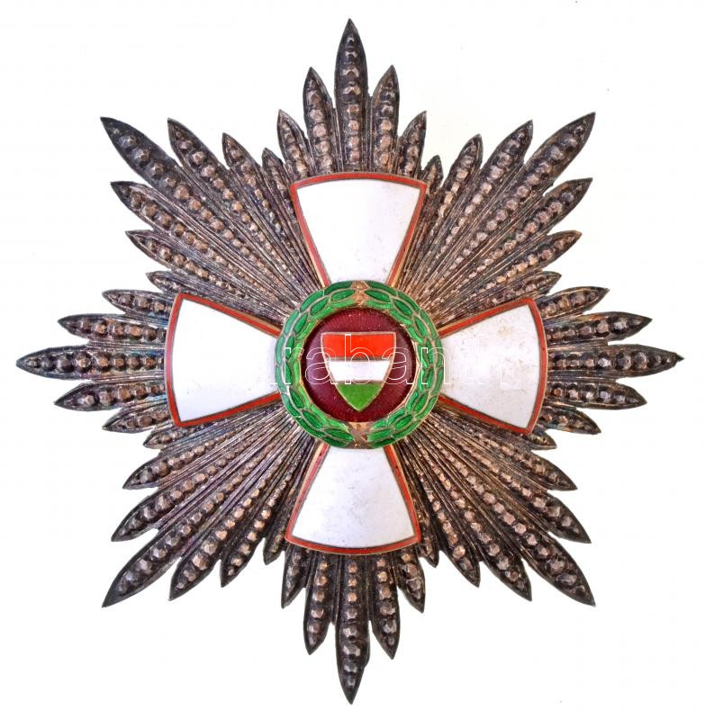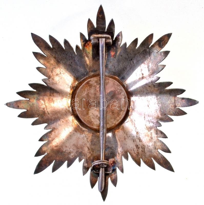 1946. "Magyar Köztársasági Érdemrend Nagykeresztjének csillaga" zománcozott Ag csillag, hátoldalán függőleges tűvel, annak belső oldalán jelzés (90mm) T:1-,2 kis hajlások a csillag szárainál /