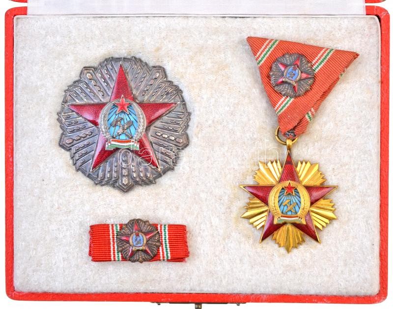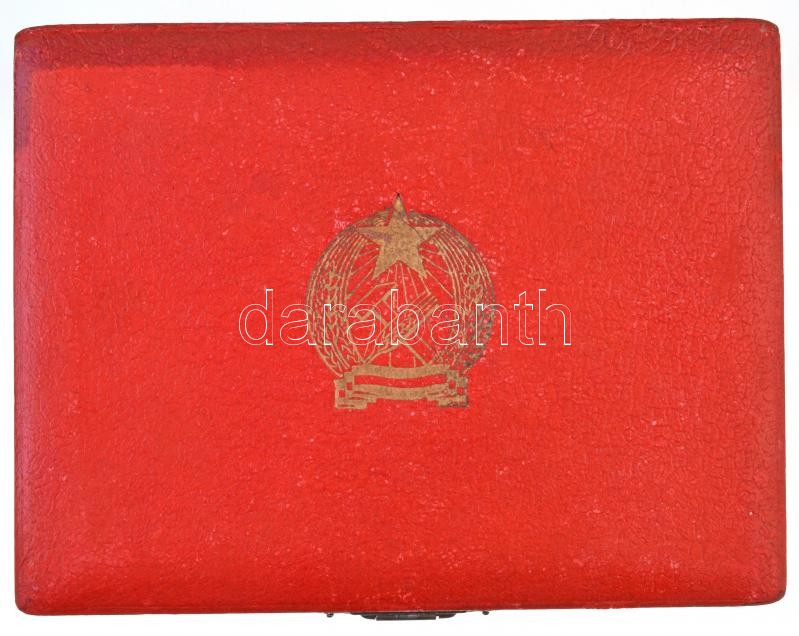 1949. "Magyar Népköztársasági Érdemrend III. fokozata" aranyozott és zománcozott Br kitüntetés mellszalagon, szalagon miniatűr, mellette szalagsáv szintén miniatűrrel, valamint ezüstszínű, zománcozott csillag függőleges tűvel, a tű belső oldalán verdejel, eredeti adományozói dísztokban! T:1-,2 kis zománchiba, csillagtest végeinél kis hajlások / Hungary 1949. "Order of Merit of the Hungarian People's Republic 3rd Grade" enamelled, and gold plated decoration with ribbon and miniature on the ribbon, also with thin ribbon and miniature, and silver colored, enamelled star with vertical pin, makers mark on inside of the pin, in original case! C:AU,XF small enamell error, some endpoint od the breast star are slightly bent NMK. 531.