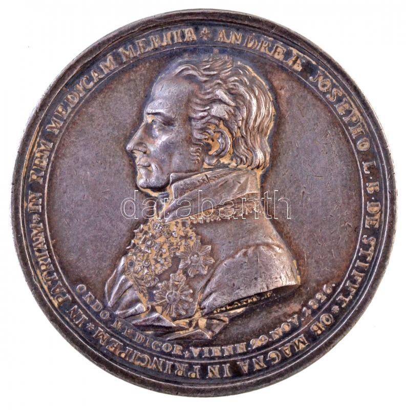 Ausztria 1826. Stiffti András József, I. Ferenc háziorvosa, Ag emlékérem "ANDRAE JOSEPHO L B DE STIFFT OB MAGNA IN PRINCIPEM IN PATRIAM IN REM MEDICAM MERITA - ORDO MEDICOR, WIENN.29.NOV.1826 / HIPPOKRATES RETRO DIRIGIT ARTE RATEM AUGUSTUM GRAVITATE MALI FERT FEBRIS AD ORCUM". Szign.: I.