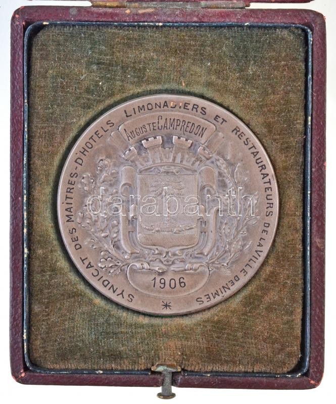 Franciaország 1906. "Francia Köztársaság 1870 / Nimes-i vendéglátós szövetség" peremen jelzett ezüstözött Br emlékérem, hátoldala gravírozva "Auguste Campredon 1906", eredeti tokban. Szign.: L.B.TTée(?) (59,01g/50mm) T:1- / France 1906. "Republique Francaise 1870 / Syndicate des Maitres-d'Hotels Limonadiers et Restaurateurs de la Ville de Nimes" silver plated Br commemorative medallion, engraved reverse "Auguste Campredon 1906" in original case. Sign.: L.B.TTée(?) (59,01g/50mm) C:AU