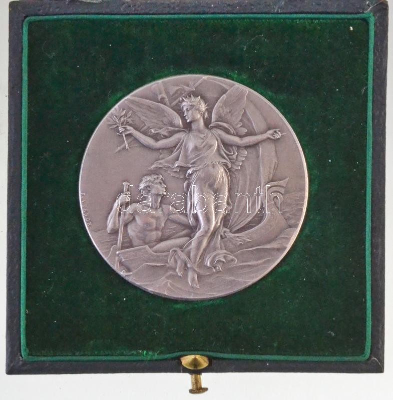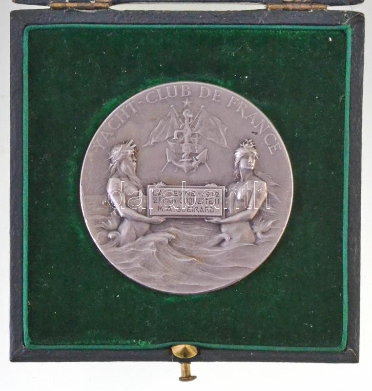 Franciaország 1912. "Francia Jacht Klub" peremen jelzett Ag emlékérem, hátoldala gravírozva "1912 Szajna - Második verseny - Coquette II - M.A. Gueirard", eredeti tokban. Szign.: F. Vernon (67,79g/50mm) T:1,1- / France 1912. "Yacht Club de France" Ag commemorative medallion, hallmarked on edge, engraved reserve "La Seyne 1912 2e Prix - Coquette II - M. Gueirard", in original case. Sign.: F. Vernon (67,79g/50mm) C:UNC,AU